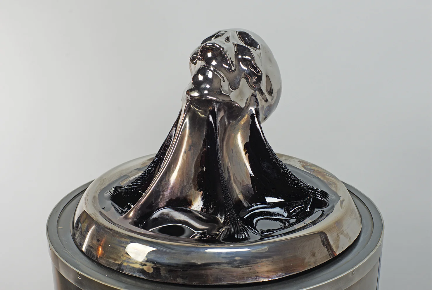 Blending bronze sculpture with real-time processing and ultrasonic sensors, reflective black ferrofluid begins to drown the emerging skull as the viewer nears. The artist custom built the electromagnet and mapped its force to direct the fluid to rise only in specific areas.